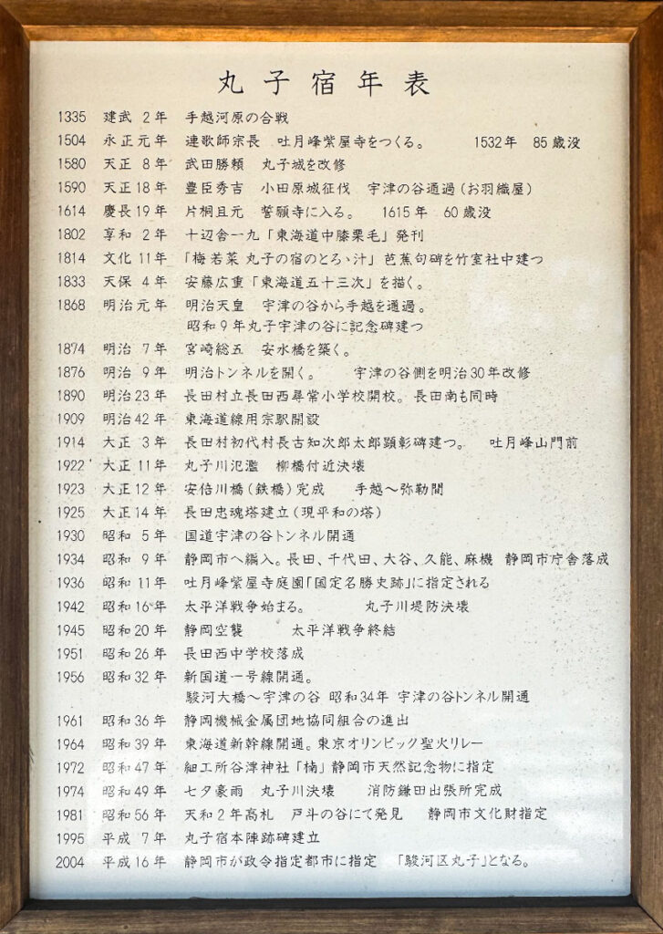 東海道二十番目の宿場町丸子宿。最も大きい府中宿(静岡)の隣、本陣一、脇本陣二、旅籠二十四軒という人口八百人の由比宿と並ぶ小さい宿場町でした。鎌倉時代は「麻利子」、その後「丸子」「鞠子」東海道になってからは「丸子」になったといわれています。また他の地域とは違い西から一丁目二丁目と続くなど上方の影響がありました。小さい宿場町でしたが、安倍川の川止め時には大名行列など大変な賑わいだったといわれています。